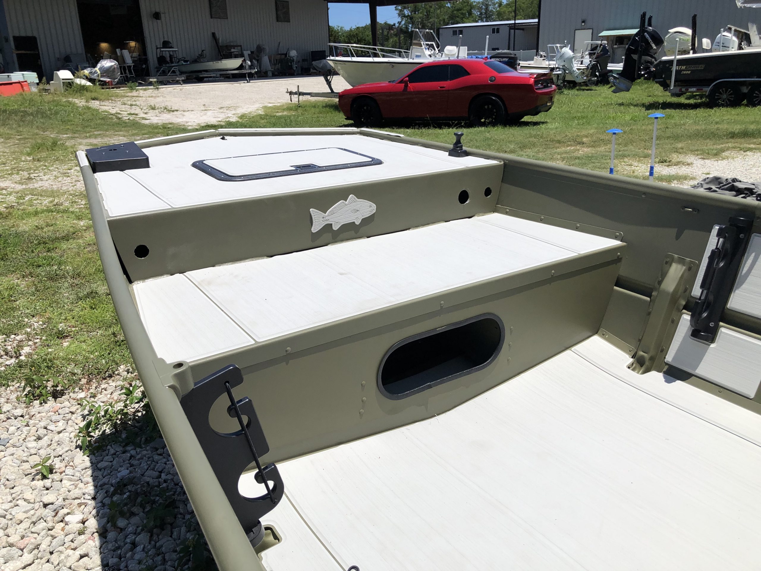 What a cool and clean custom jon boat!! Lots of thought and effort went into customizing this very capable skinny water skiff for fishing the backcountry of Mosquito Lagoon. A personal life change brings this unique rig available for sale after only a mere 2 break-in hours of use! The welded raised deck allows for excellent use of a bow mount trolling motor and increases built in storage volume. The tubes will protect fly rod tips. The sea-dek flooring is very comfortable and shock absorbing. Many may not see value in this skiff, but for someone also looking to customize a similar setup, this opportunity should be appealing!